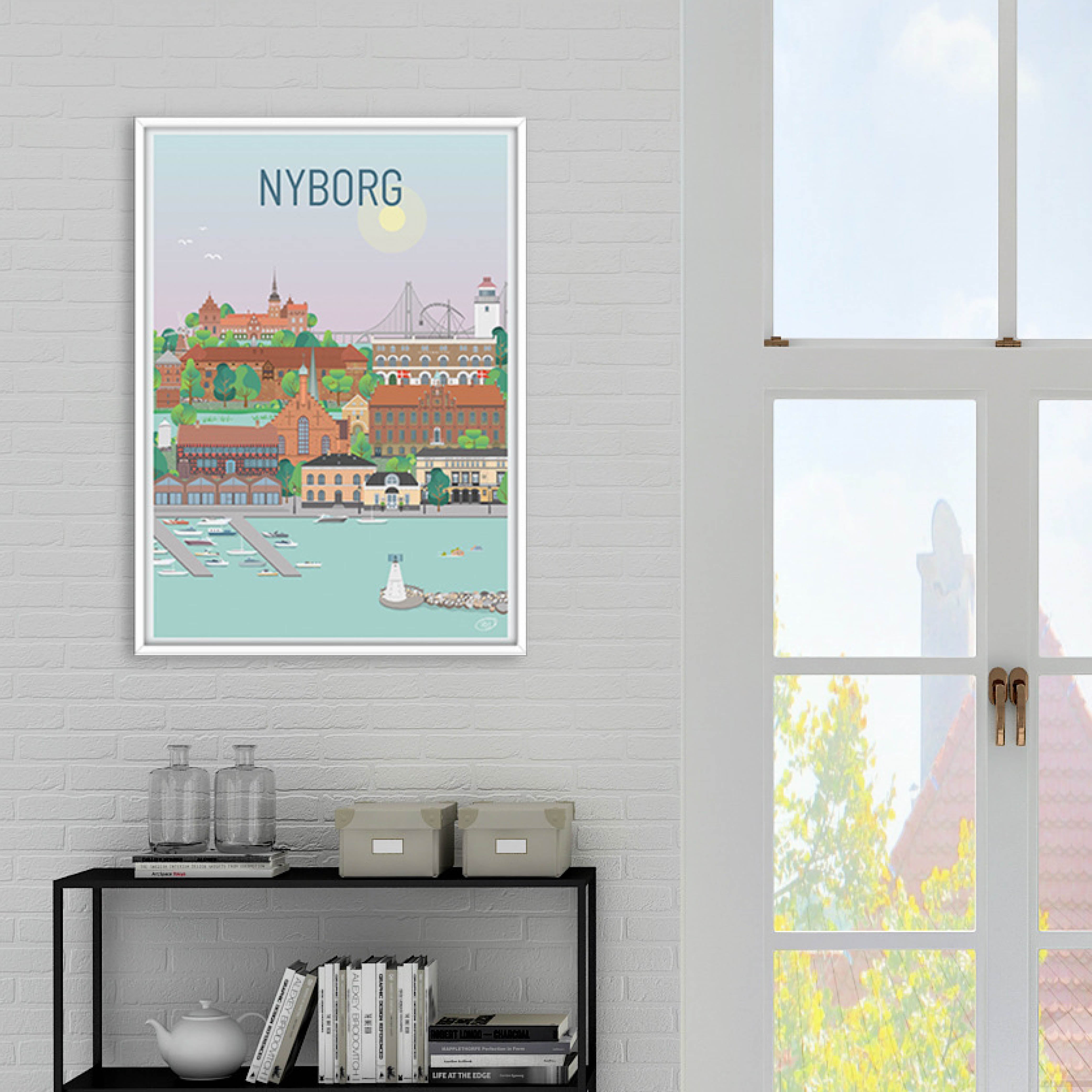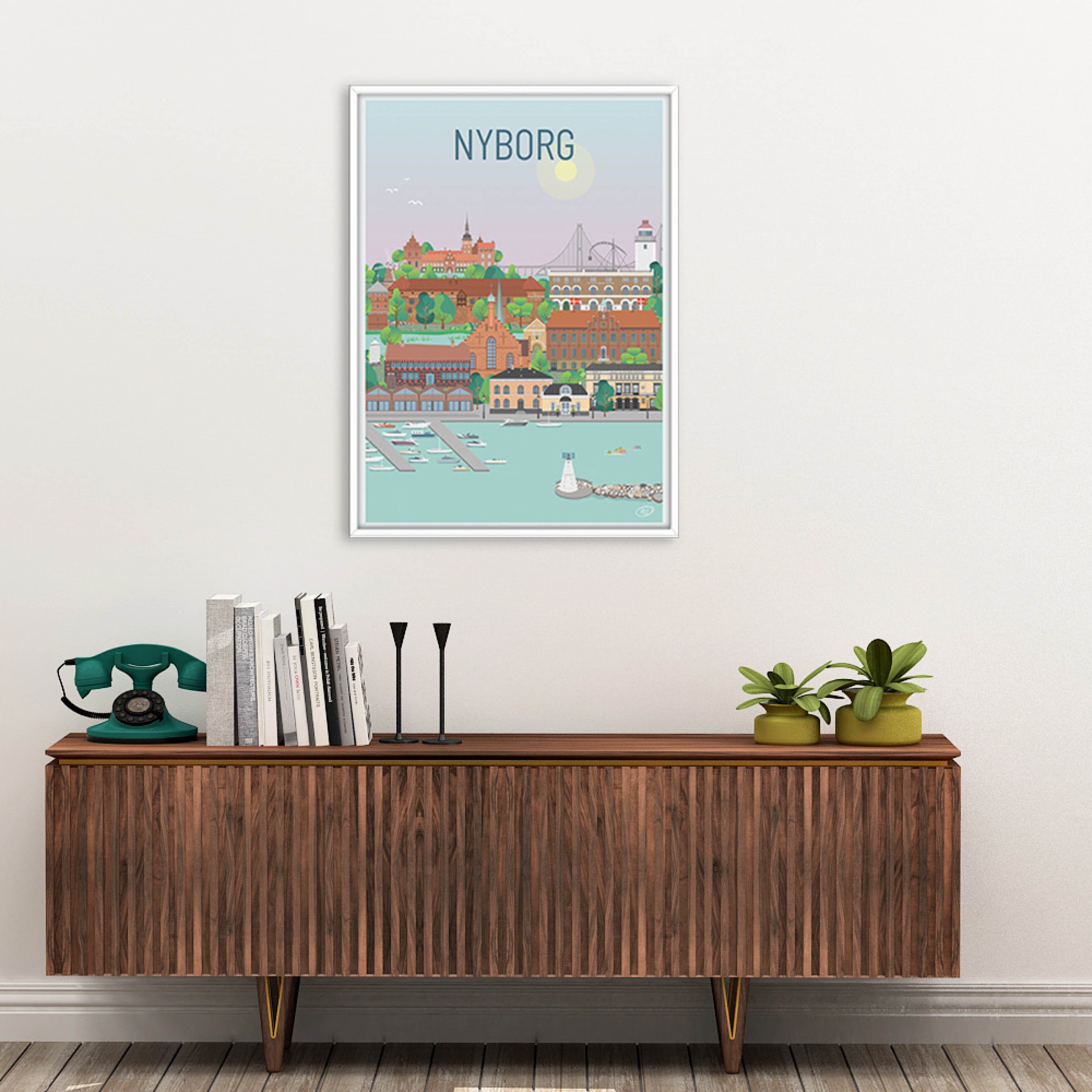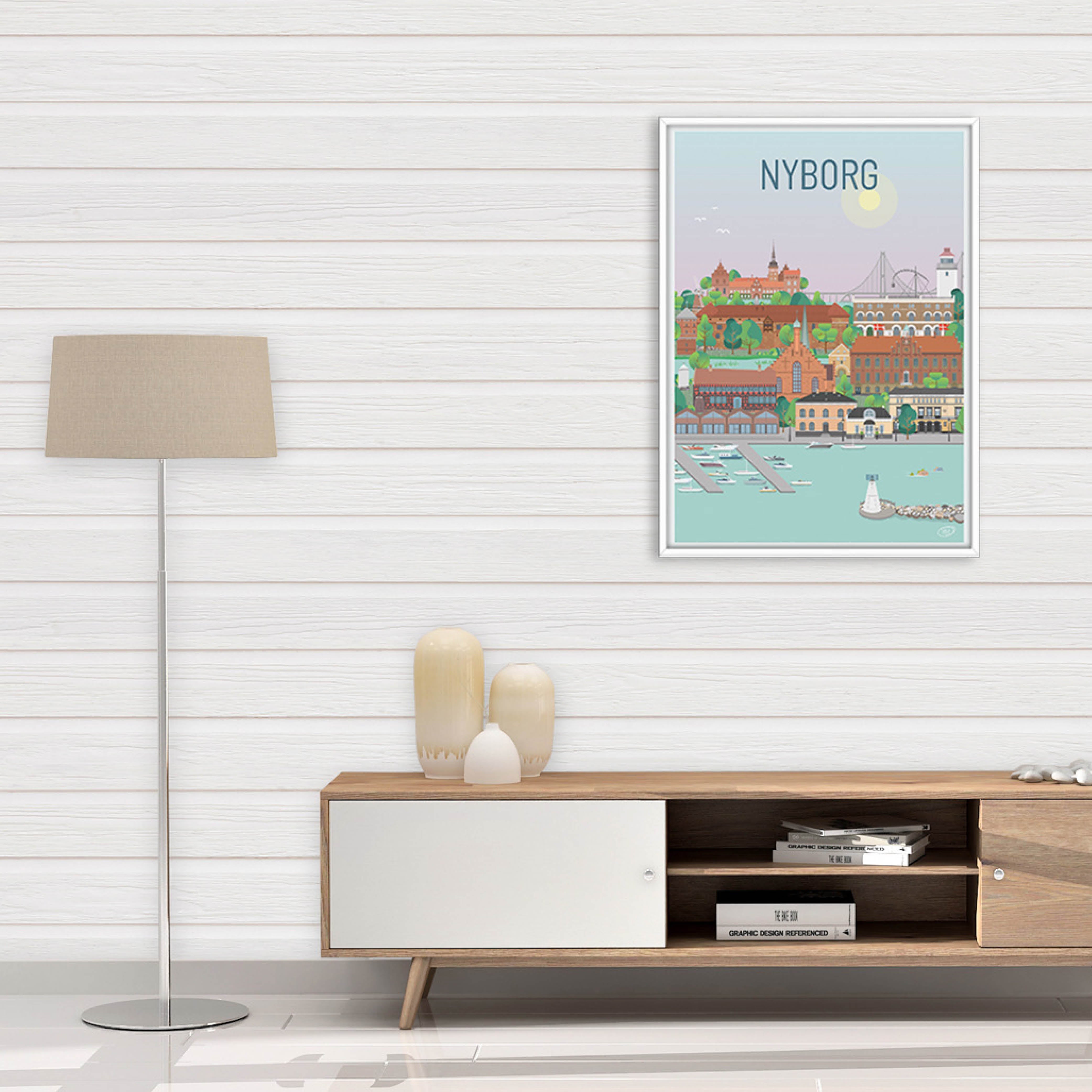 Ein wunderschönes und detailliertes Stadtplakat von Vilakula mit dem Motiv des schönen Nyborg. Hier haben sie die Atmosphäre der Stadt sowie einige der wunderschönen Gebäude der Stadt eingefangen. Das wunderschöne Nyborg-Poster ist in einem farbenfrohen Universum gestaltet, das die Wände jedes Hauses wunderschön schmückt und einen Kontrast zu den schwarz-weißen Häusern schafft.