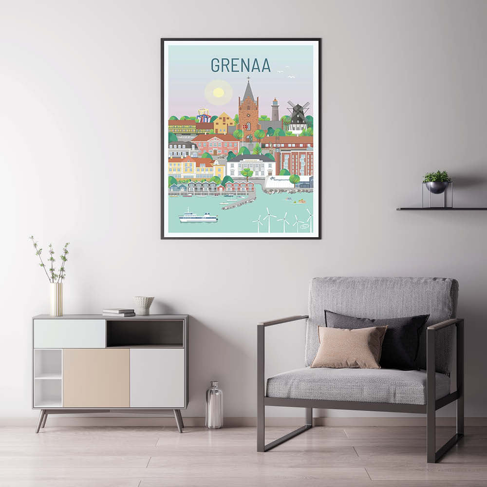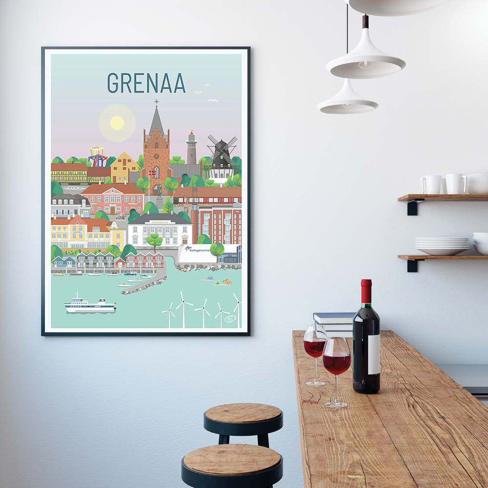 Ein wunderschönes und detailliertes Stadtplakat von Vilakula mit dem Motiv des schönen Grenaa. Auf dem Plakat finden Sie unter anderem die alte Baunhøj-Mühle, die Hafenumgebung und die Grenaa-Kirche. Vilakula hat die Atmosphäre der Stadt sowie einige der wunderschönen Gebäude der Stadt eingefangen. Das wunderschöne Grenaa-Poster ist in einem farbenfrohen Universum gestaltet, das die Wände jedes Zuhauses wunderschön schmückt und einen Kontrast zu den schwarz-weißen Häusern schafft.