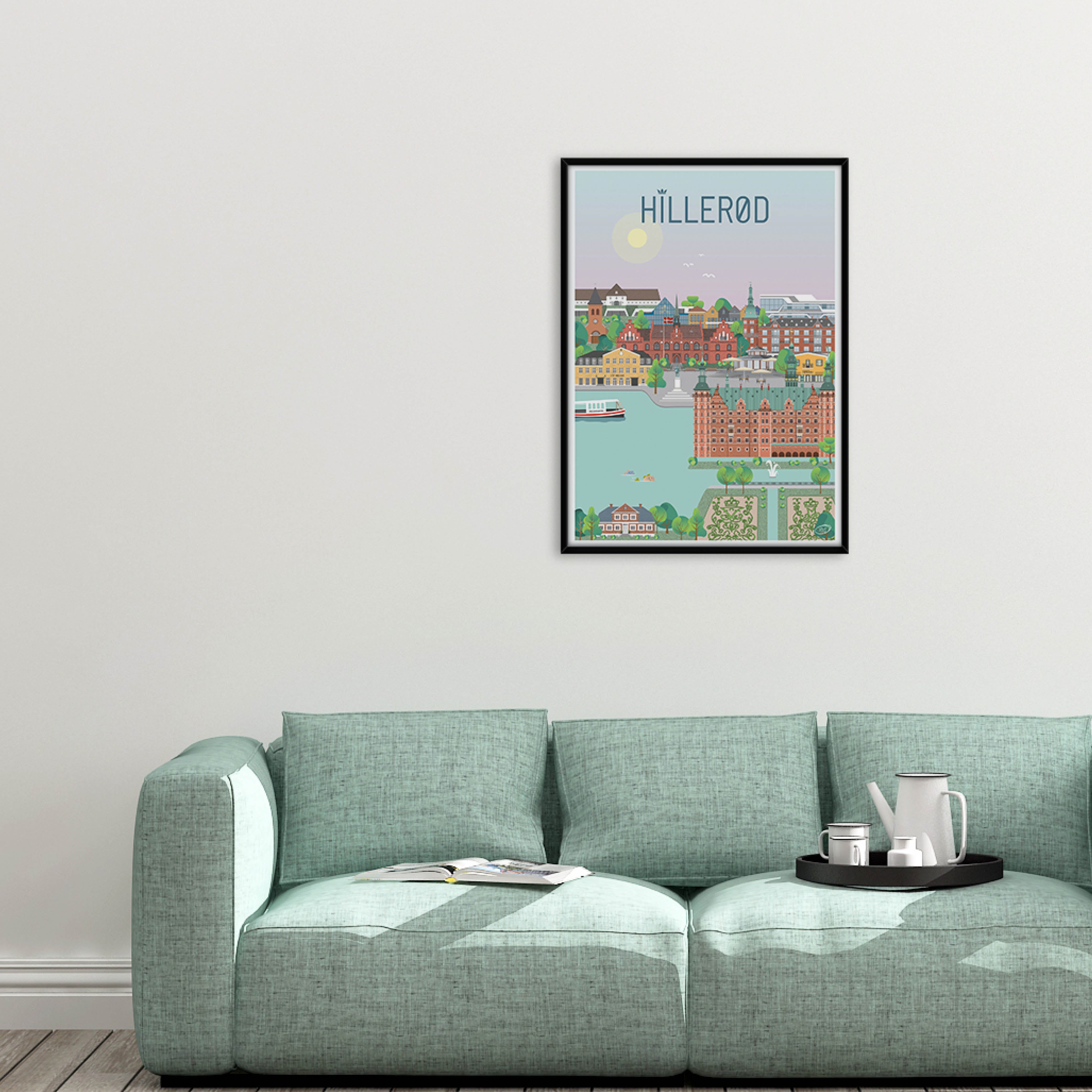Ein wunderschönes und detailliertes Stadtplakat von Vilakula mit dem Motiv des schönen Hillerød. Hier haben sie die Atmosphäre der Stadt sowie einige der wunderschönen Gebäude der Stadt eingefangen. Das wunderschöne Hillerød-Poster ist in einem farbenfrohen Universum gestaltet, das die Wände jedes Hauses wunderschön schmückt und einen Kontrast zu den schwarz-weißen Häusern schafft.